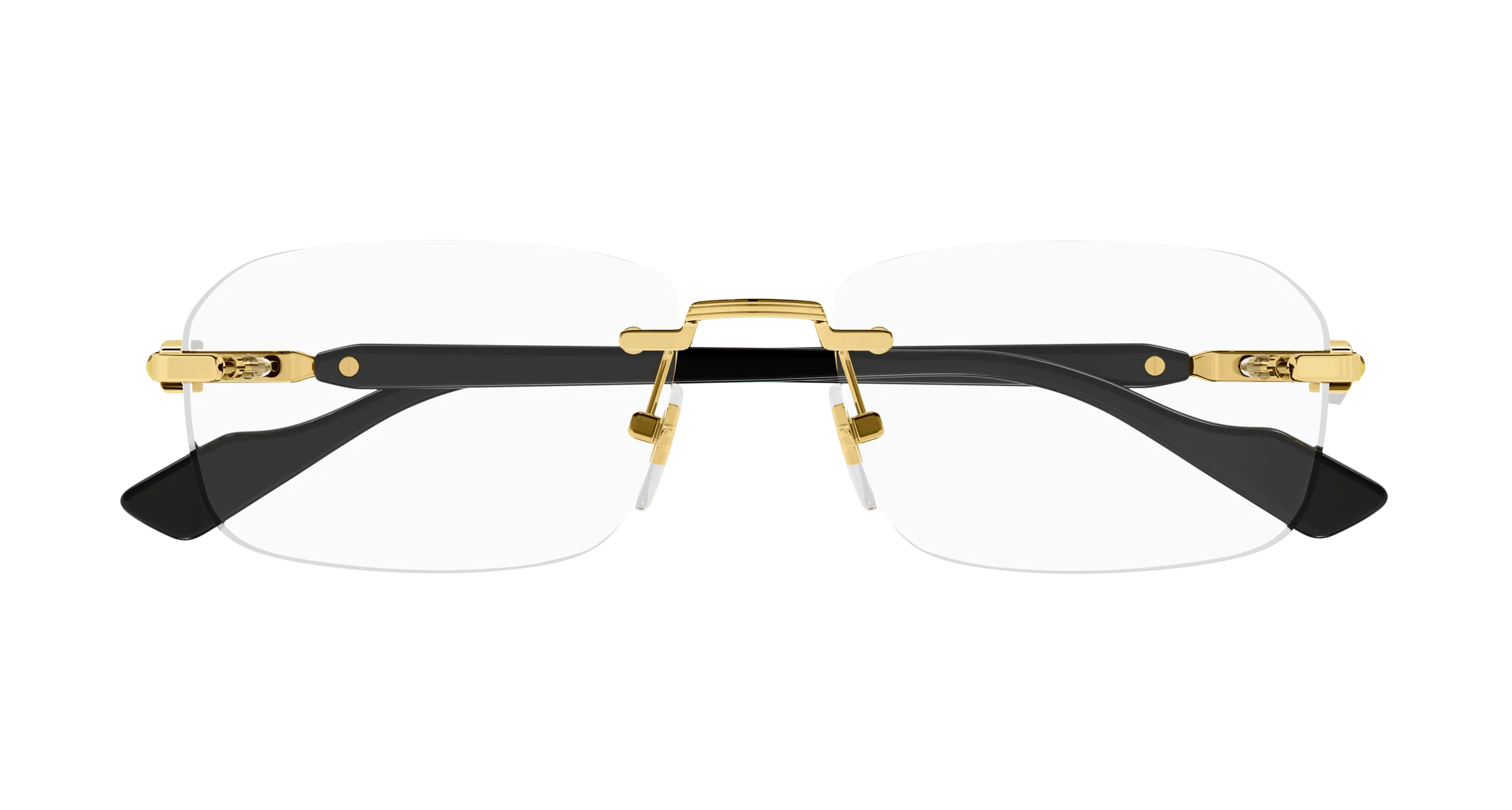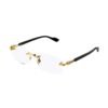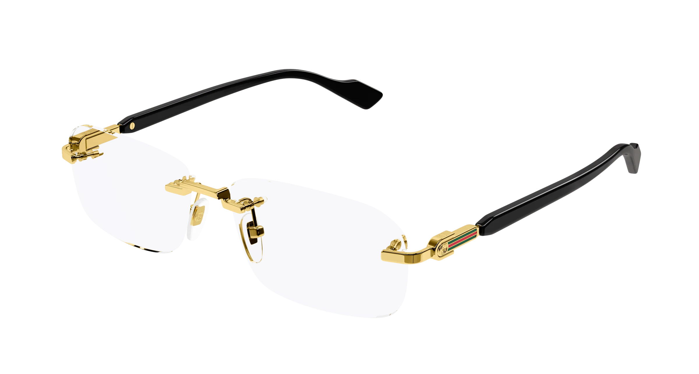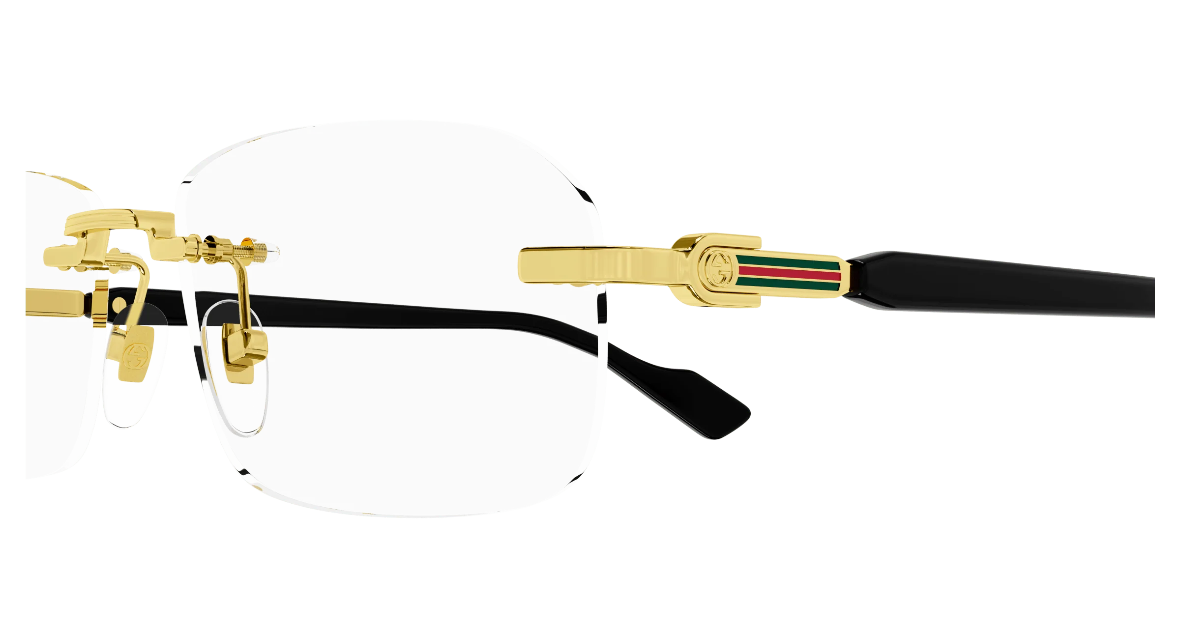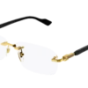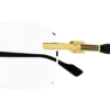 Gli occhiali da vista Gucci GG1221O offrono un design rettangolare, con aste sofisticate impreziosite dal logo GG intrecciato in oro e dettagli in smalto che richiamano il motivo web.